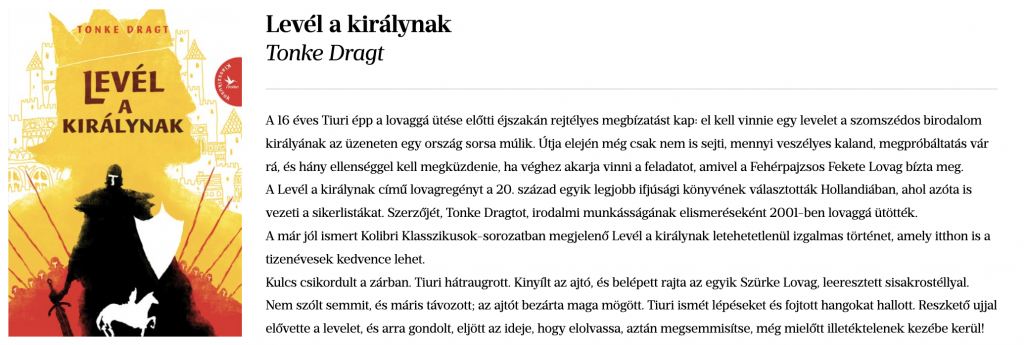 Március 20-ától látható a Netflix műsorán a Levél a királynak című holland regényből készült sorozat. Szerzője Tonke Dragt, akinek a könyve nemrég a magyar Nemzeti alaptantervbe is bekerült. A könyvet Magyarországon a Kolibri adta ki 2017-ben, vagyis épp 55 évvel az után, hogy Hollandiában először vehették kezükbe az olvasók. Olvasd tovább az ajánlót itt: